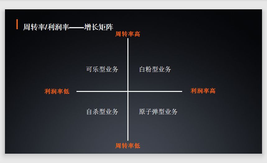 周转率高、利润率高,我把它叫做“白粉型”的业务。也就是说,利润非常高,还卖得非常快。