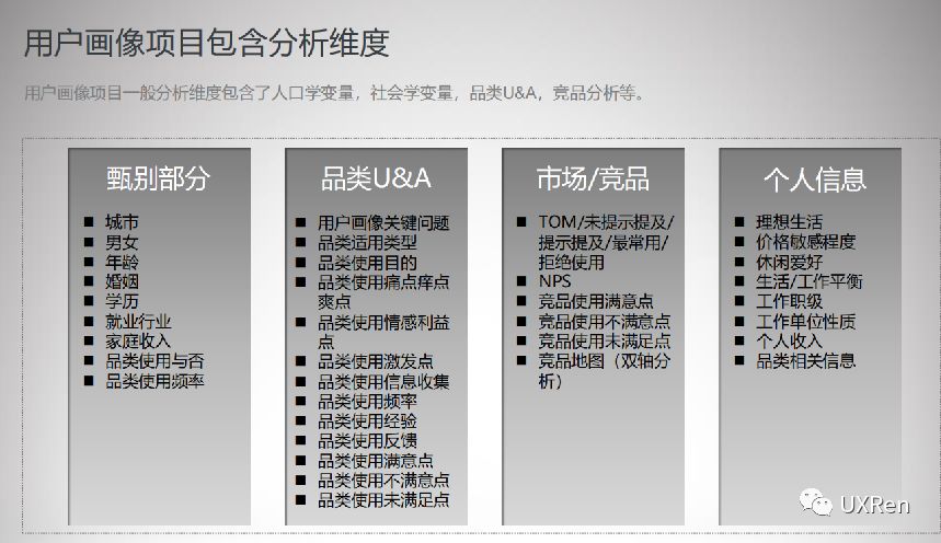 这个分析维度是我们总结的在用户画像项目中可以用到的能想到的分析维度,这些维度可以对大家定量的问卷以及定性访问都可以进行参考。