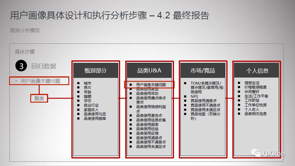 案头分析+内部团队沟通,通过桌面资料、内部资料收集,内部工作坊的沟通,最终达成内部期待值一致的可用于下一步验证的用户画像分类。