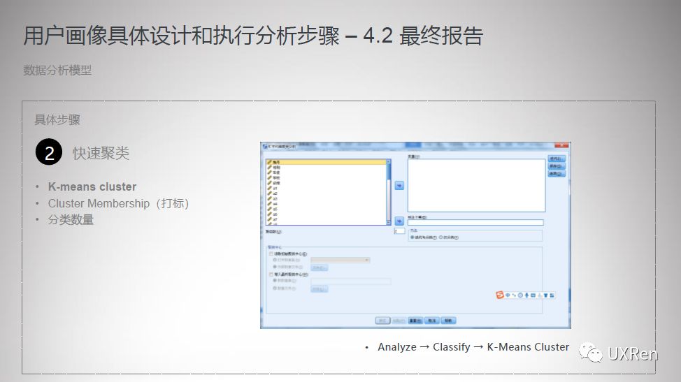 操作步骤:将前一步验证后可用于分类的态度语句纳入聚类因素-将每一个用户所属类别进行打标(Cluster membership)-确定分类的数量