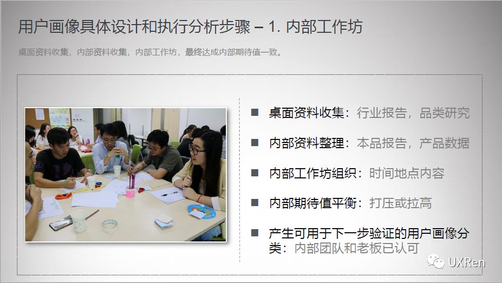 内部工作坊组织:最终是对内部期待值的平衡,知道我们需求方想要的是什么,对项目的期待是什么,并根据我们之前的准备对需求方的期待进行平衡,我们最终可能会产出什么样的。并且产生可用于下一步验证的用户画像分类。