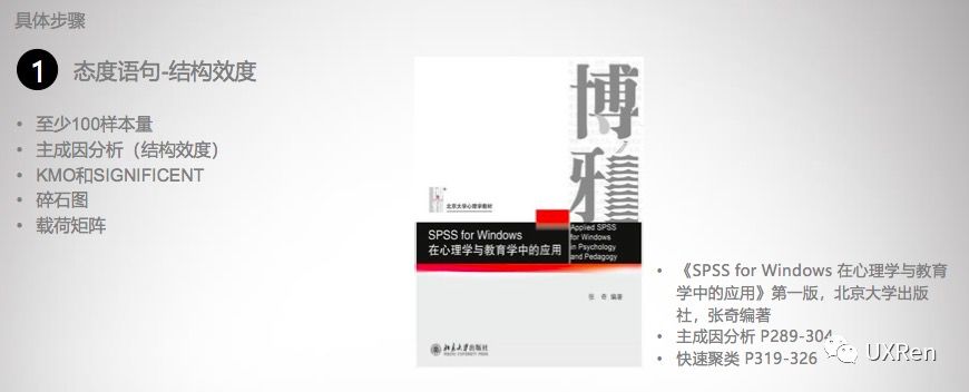 结构效度的验证(所有的操作都可以在这本书上找到《SPSS for Windows》)操作步骤:主成分分析、KMO(KMO>0.8)和显著性(p<0.05)、碎石图(寻找最大拐点,k-1)、载荷矩阵(删除标准:在多个公因子上载荷相近;只在某个公因子下有载荷;最大载荷<0.35,共同度<0.4),最终确定可用于分类的态度语句。