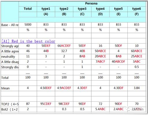 操作:最终可以做出这样的一张表,表的上面的type1、2是根据前面的统计学得出来的用户分类,下面是第A1道题每个选项上每一类人与其它人是否有显著差异(红色的字母就表示在这道题的这个选项上这一类人与其它的那类人有显著差异),这样就可以看出不同人群件的差异,在回答问题时的偏好。