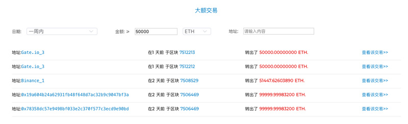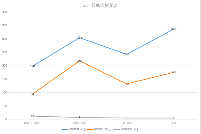 不过,本周“5 万以上 ETH” 大额转账的次数仍然不高,只有 6 次,最高转账数额不到 10 万枚 ETH;与前几周不同的是,本周转账最后并未汇集到排名前100百的富豪榜地址。
