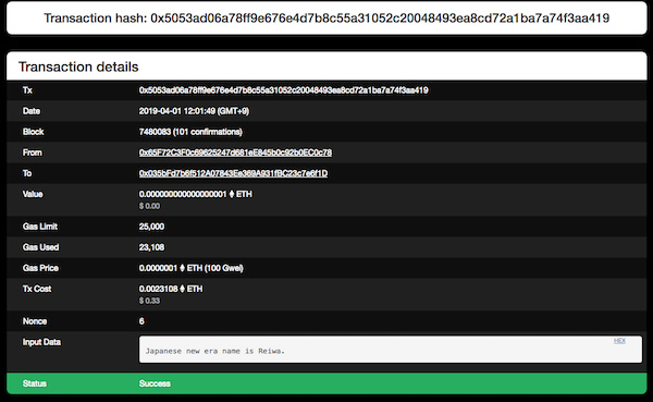 本周,日本公布了新年号“令和(Reiwa)”,该年号现已被日Staked Technologies首席执行官渡边创太记录在以太坊区块链上,区块高度为7480083。