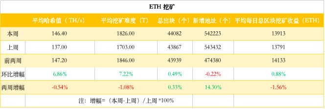 etherchain.org数据显示,目前ETH出块时间约为 13.3 秒;全网平均算力为 146 TH/s,环比上涨 6.86 %;平均挖矿难度为 1826 T,环比上涨 7.22 % 。