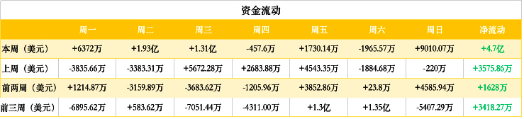 资金方面,本周资金波动较大。其中周二、周三净流入资金相对较高,均超过 1.3 亿美元;周四净流出资金最多,达到 1900 万美元;ETH 本周全网资金净流入约 4.7 亿美元,环比上涨 1200 %。