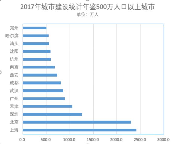 为了数据更为准确(虽有滞后),我们沿用了住房和城乡建设部2019年1月24日发布的《2017年城市建设统计年鉴》,超过500万人口的城市包括郑州、哈尔滨、汕头、杭州、北京、上海等14座城市。当然我们不排除很多城市在2018年抢人大战后也顺利进阶到这一梯队,但按照这最近一次官方统计数据显示,至少14座城市在此之列。