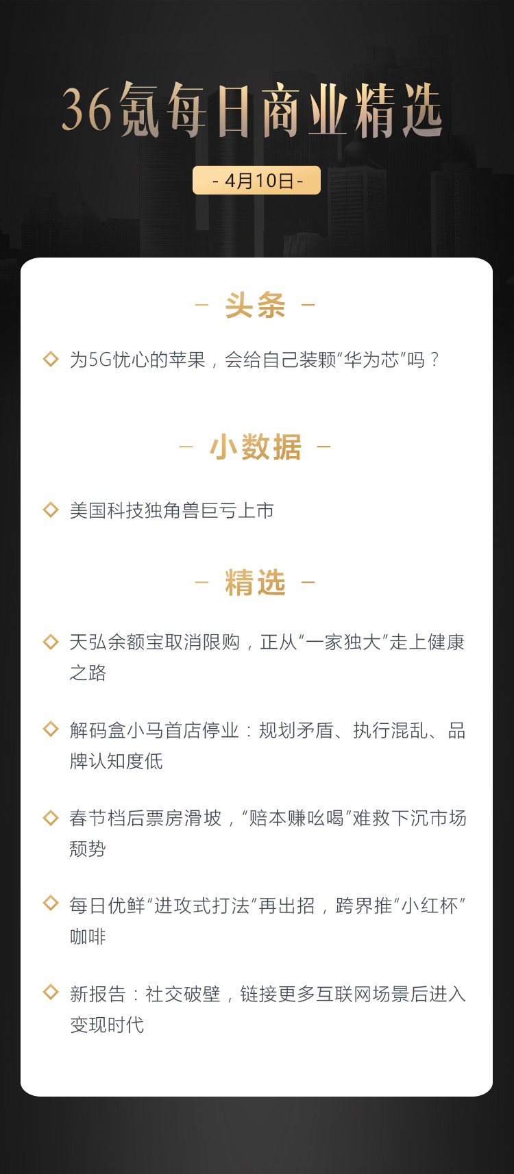 本文来自36氪付费栏目《36氪每日商业精选》——4月10日