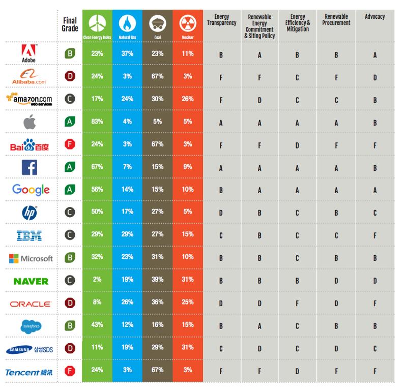 作为个人,在浏览网站和白皮书的时候,很难对大型云供应商恪守承诺到什么样的程度形成客观意见。2017年,Greenpeace发布了一份报告,里面评估了主要技术公司对环境的影响。下面就是这份报告给出的评分。