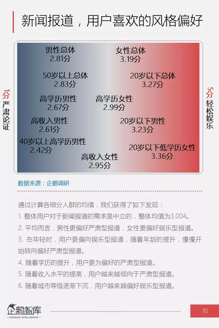 男性相比女性更偏好严肃论证式新闻报告,年轻人相比成年人更偏向轻松娱乐式报告,对严肃式新闻关注最高的,是40岁以上高学历男性,对娱乐式新闻关注最高的,是20岁以下低学历女性。 -