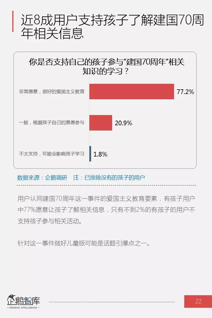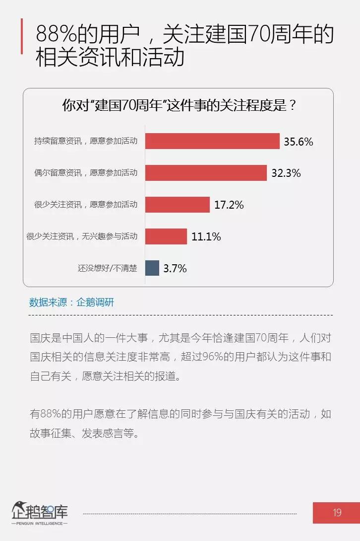 用户对大事件的关心程度较高,88%的用户对新中国成立70周年相关的资讯和活动表示关注。