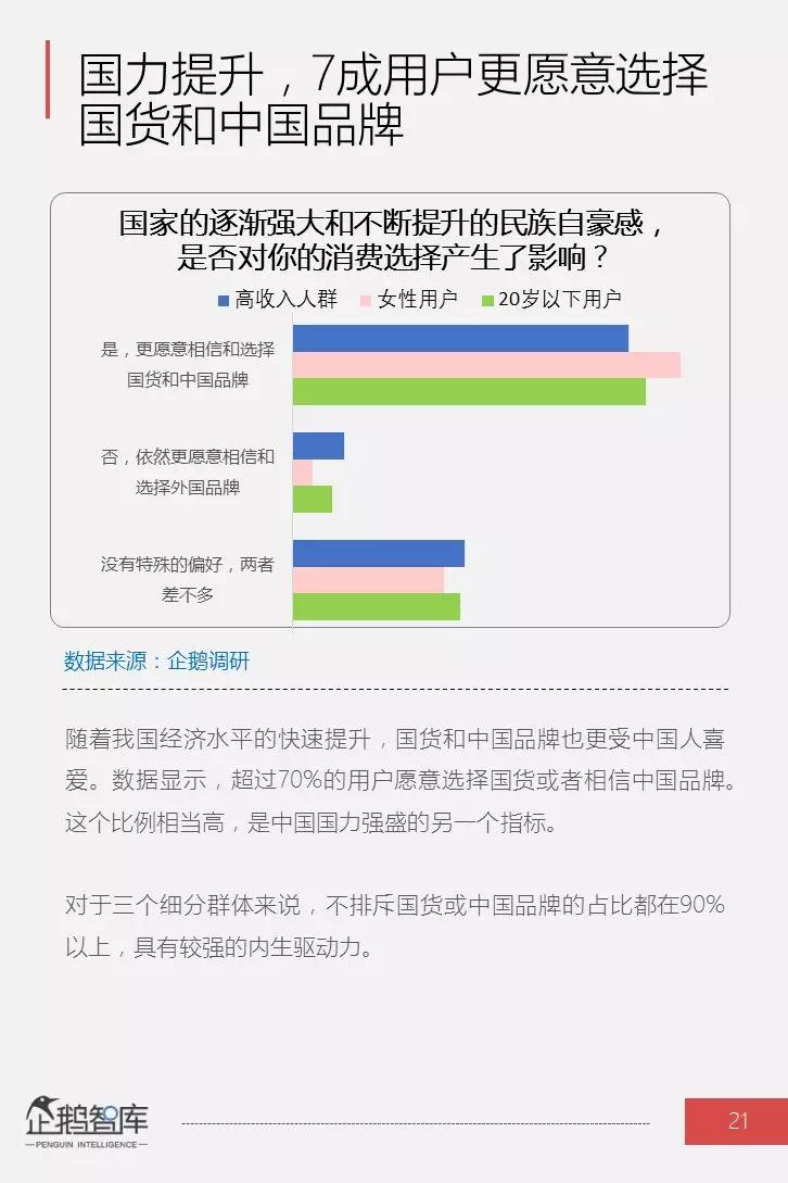 新闻资讯类用户对国力提升的感知度和中国制造的信任度很高,七成用户更愿意相信国货和中国品牌。