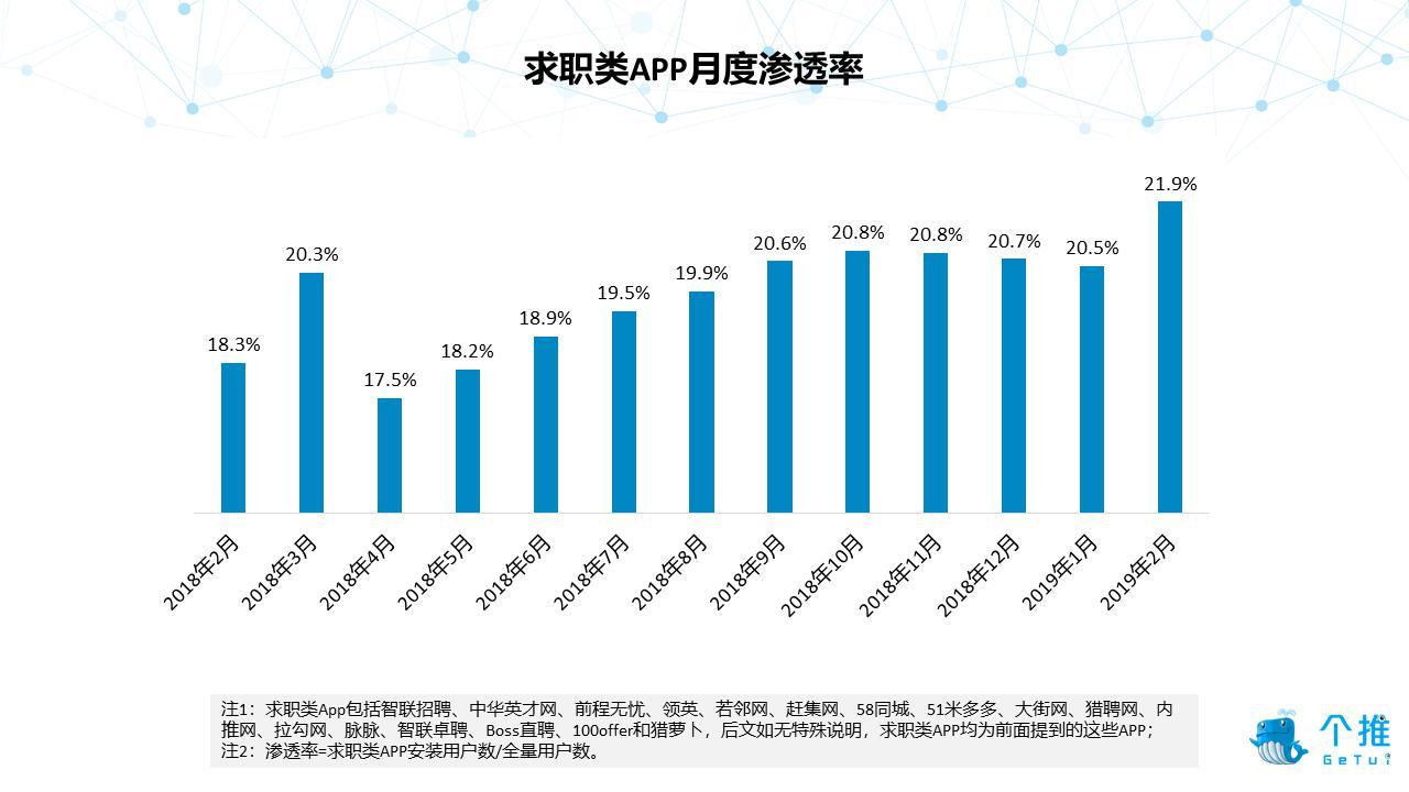 个推大数据显示,春节过后为找工作的高峰时期,,2018年2月求职类APP渗透率为18.3%,2019年2月求职类APP渗透率达到21.9%,同比增长19.7%。