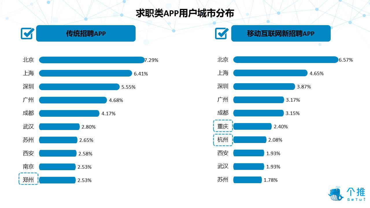 河南作为我国第三人口大省,其省会郑州拥有大量的劳动力,且主要从事传统行业,传统招聘类APP的用户城市分布排名中,郑州和南京并列第九。
