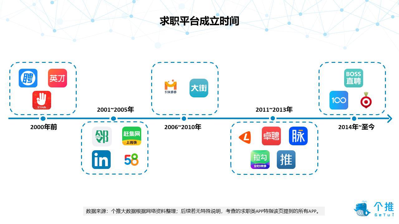 个推大数据选取传统招聘APP和移动互联网新招聘APP进行了对比,传统招聘APP包括前程无忧、智联招聘和中华英才网,移动互联网新招聘APP包括拉勾网、Boss直聘、猎聘、脉脉和领英。