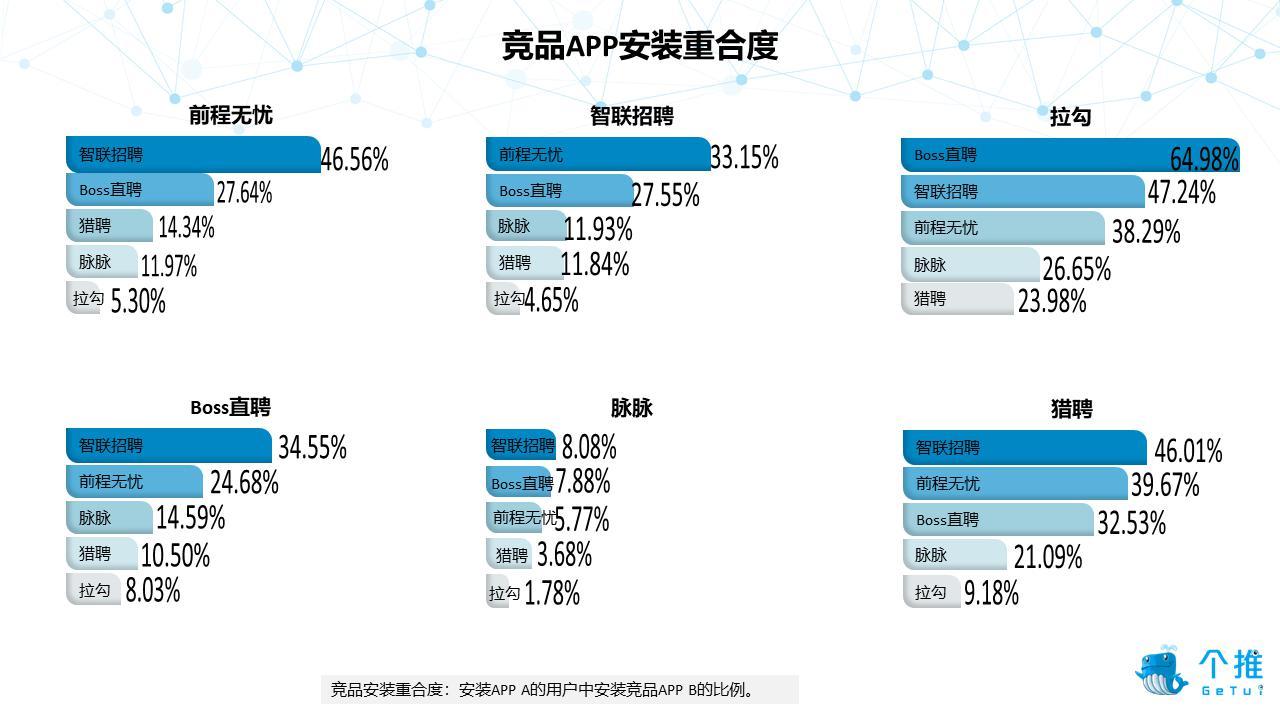 从竞品安装重合度数据来看,拉勾和Boss直聘的用户安装重合度最高,达到64.98%,其次是前程无忧和智联招聘,安装重合度为46.56%。