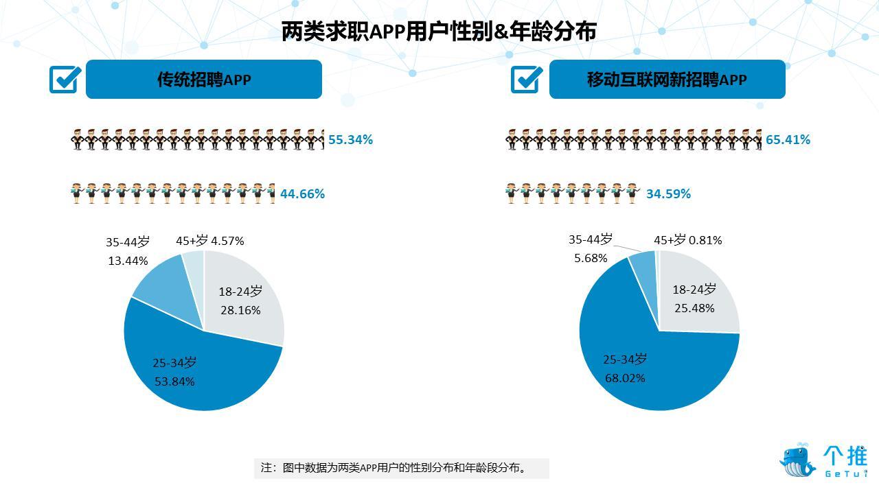 个推大数据显示,传统招聘APP用户中男性占比55.34%,移动互联网新招聘APP用户中男性占比达到65.41%。相较传统招聘类APP,移动互联网新招聘APP用户的男性占比更高。
