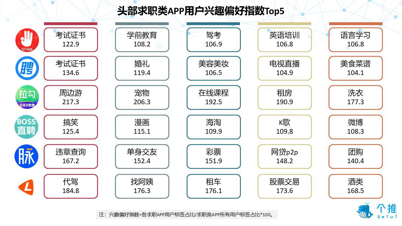 不同求职APP的用户兴趣偏好具有明显差异。前程无忧和智联招聘的用户具有强烈的职场危机感,工作的同时在不断充电学习。拉勾和Boss直聘的用户偏年轻化,工作的同时也不忘享受生活。脉脉作为主打社交生态的求职APP,用户分布各行各业兴趣广泛,猎聘的用户更偏高端职场精英范儿。