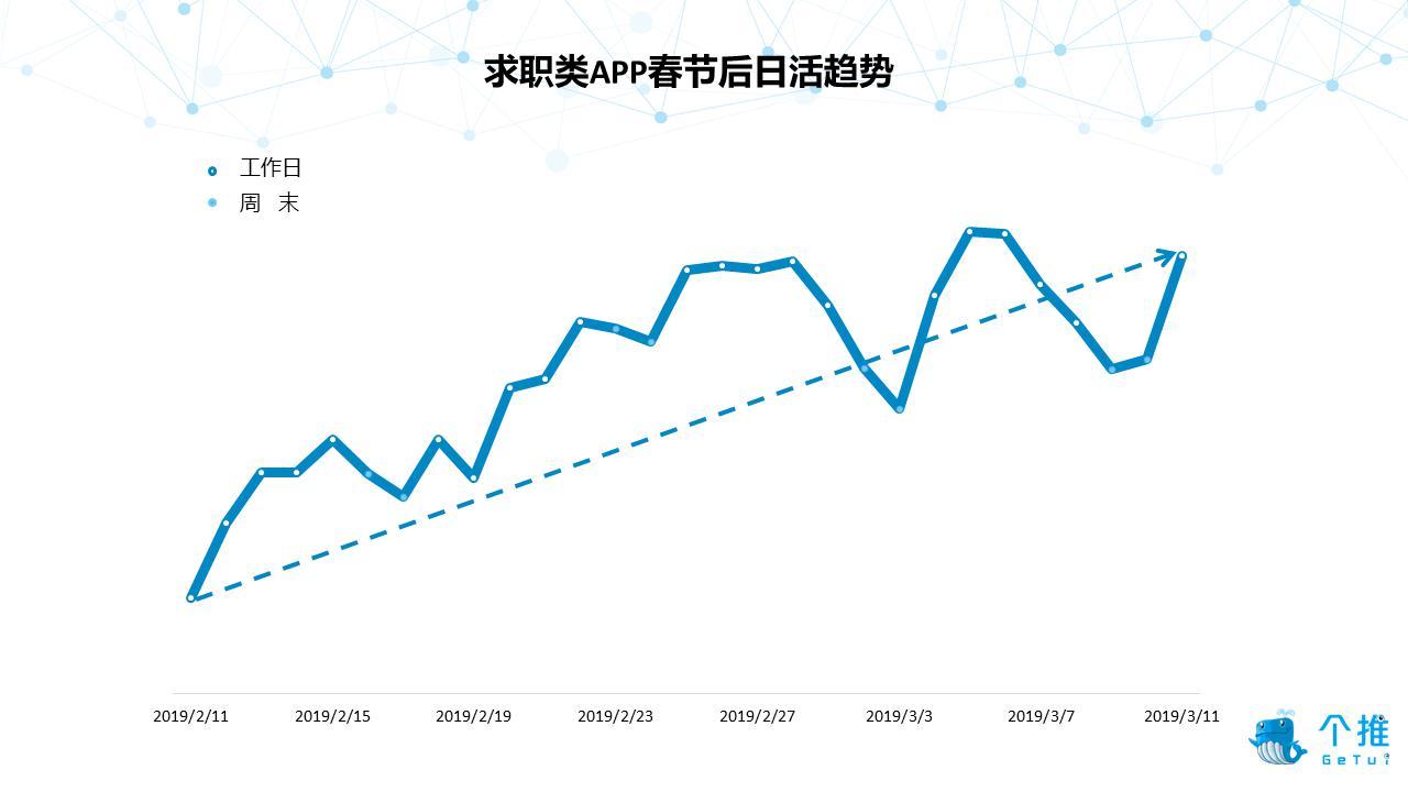 个推大数据显示,2019年2月11日(正月初七)开始,求职类APP日活显著上升,求职者更倾向于在工作日打开招聘APP查看工作机会,周末时间求职类APP日活均呈现下降趋势。