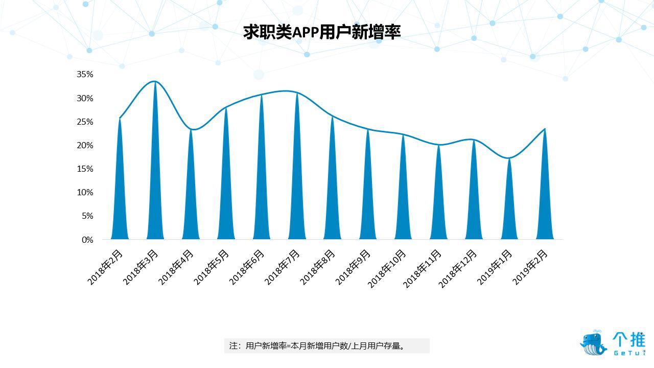从求职类APP用户增长率数据来看,2月~3月为新用户集中式增长时间段, 受2018年世界杯期间广告效应推动,6月~7月新用户也有较大幅度的增长。