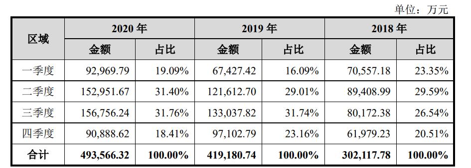 季节性消费对能量饮料的影响,也是东鹏与生俱来的问题之一。其招股书显示,从2018年到2020年,东鹏饮料每年二、三季度的产品销售占比相加超过总营收的50%到60%。官方解释道:“由于二、三季度气温较高时能量消耗较大,补充摄入能量的需求量相对更加旺盛,公司其他产品如由柑柠檬茶、陈皮特饮等亦属于解暑消夏饮品。”