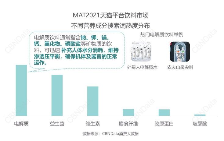 CBNData《2021饮料消费趋势洞察》显示,在线上渠道,气泡水、茶饮料、植物蛋白饮料等越来越受到90后青睐。从细分领域看,矿物成分含量更丰富,饮用口感更好的电解质水则被视为更“营养健康”的选择。