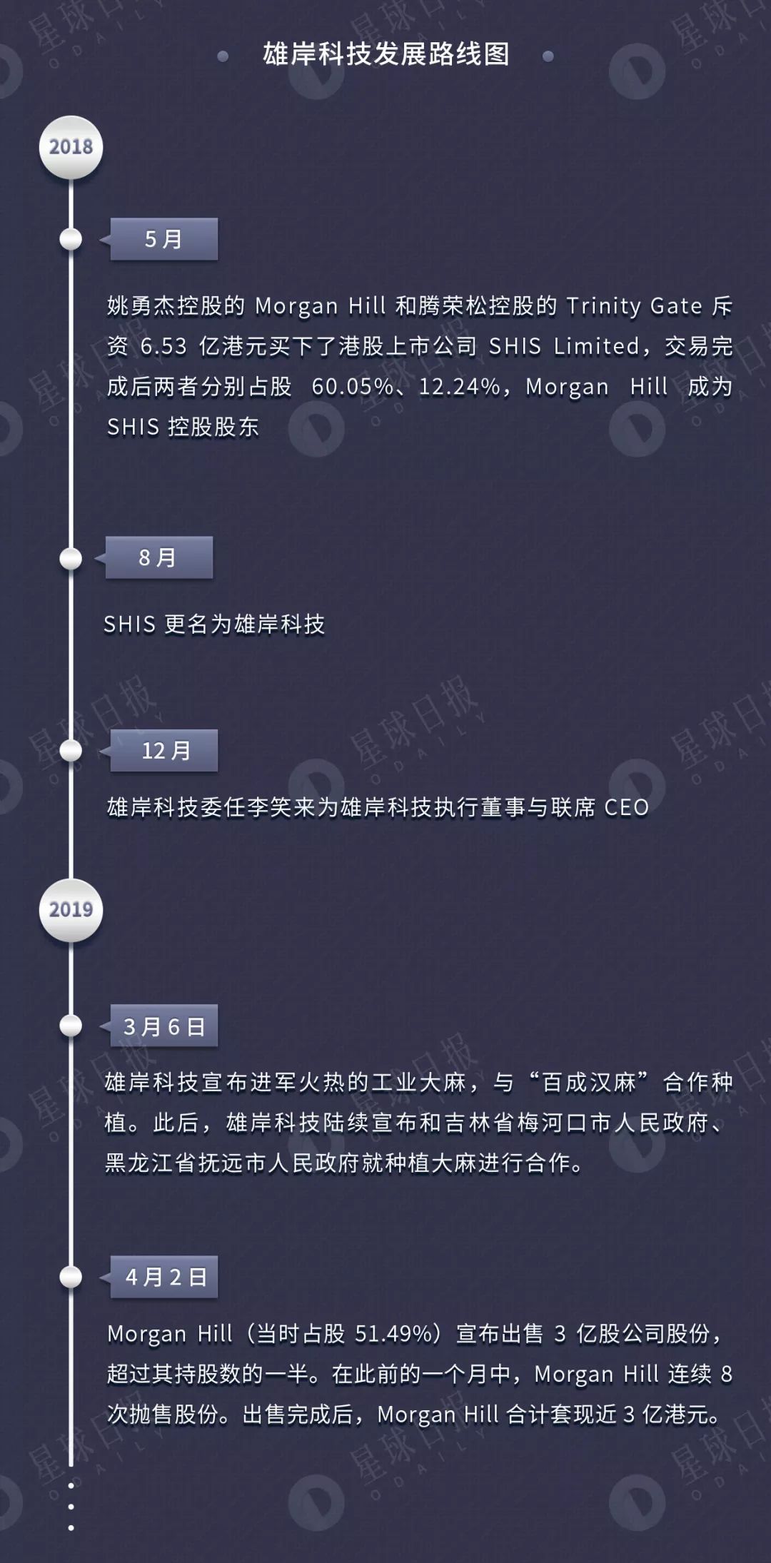 2018 年 4 月,Morgan Hill 和裂变资本两家公司买下了港股上市公司 SHIS Limited(雄岸科技前身,股票代码:01647.HK)7.5 亿股股份。