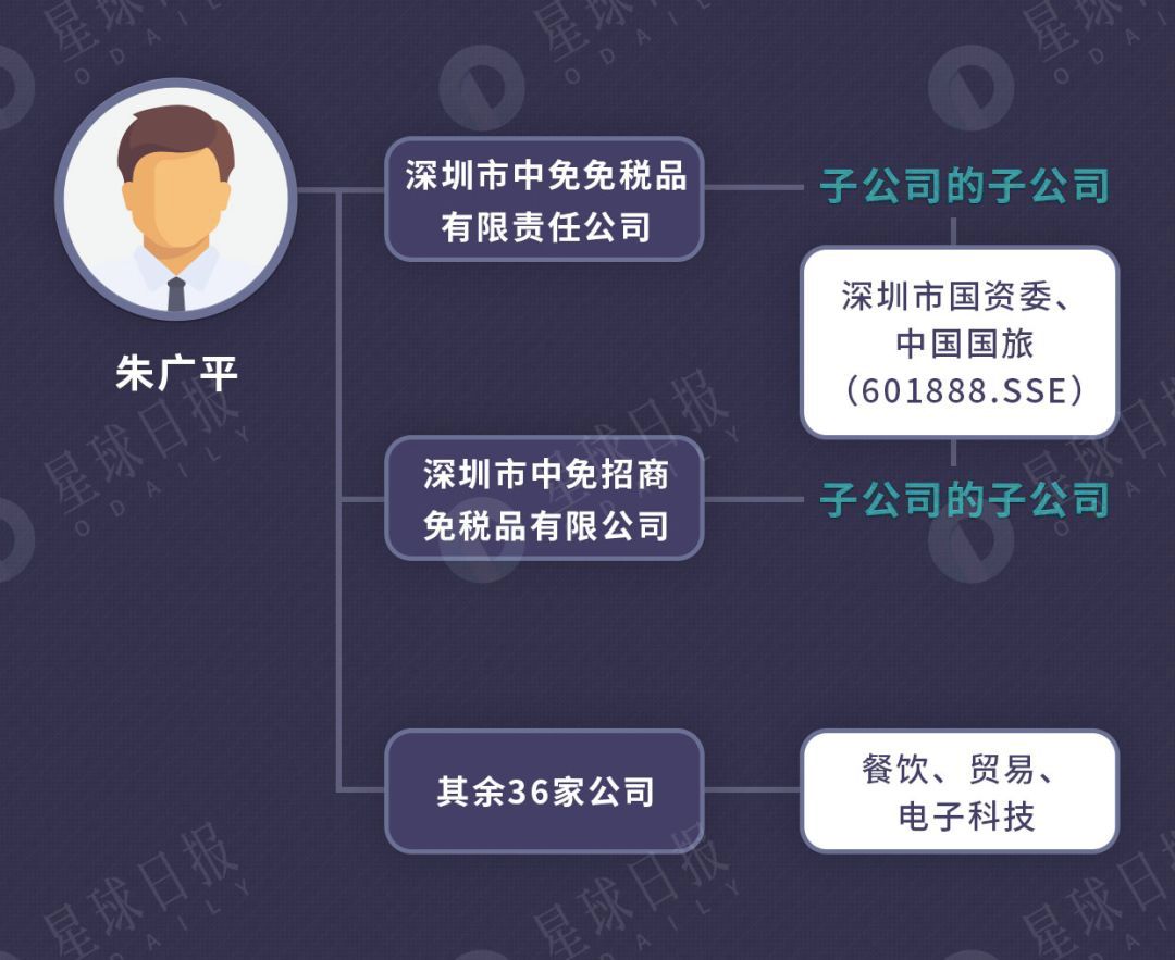 天眼查数据显示,朱广平是深圳市中免免税品有限责任公司以及深圳市中免招商免税品有限公司法人及董事长,这两家公司的母公司分属深圳市国资委以及上市公司中国国旅(601888.SSE)。此外,朱广平旗下有36家公司,主要涉及投资、进出口贸易、餐饮、电子科技等领域。
