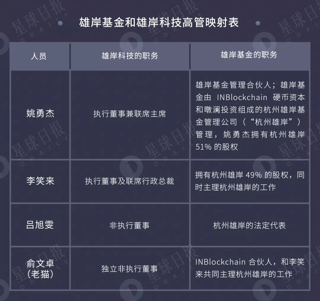 姚勇杰是雄岸基金创始人之一,并拥有杭州雄岸投资管理有限公司(以下简称‘杭州雄岸’) 51% 的股权,雄岸科技的执行董事兼联席 CEO 李笑来则拥有杭州雄岸 49% 的股权,雄岸科技非执行董事吕旭雯则是杭州雄岸的法定代表。