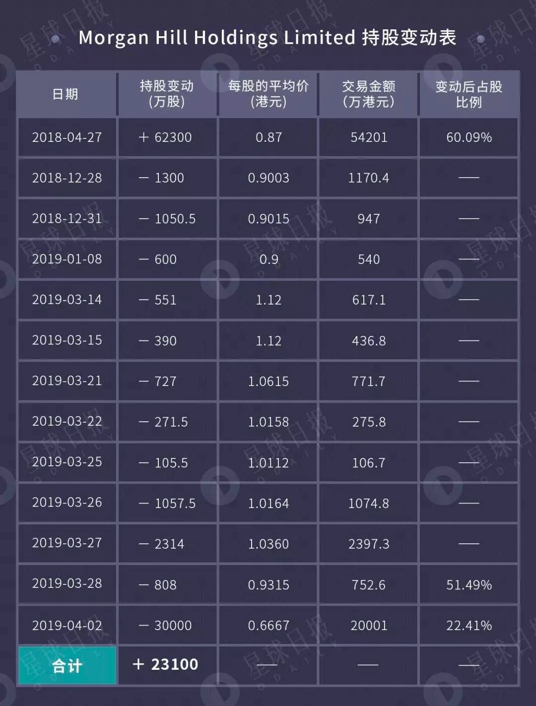 如下是 Odaily星球日报整理的Morgan Hill 自入主雄岸科技后的持股变动表。