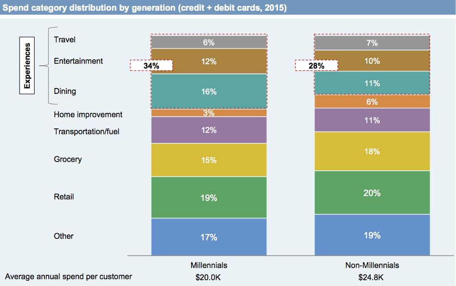 首先是他们更愿意为体验式消费花钱。根据摩根大通早先的一份报告,与父母和祖父母相比,千禧一代更喜欢把钱花在体验事物上,他们为旅行,娱乐和餐饮等付出的钱更多,而不一定需要完全买买买。