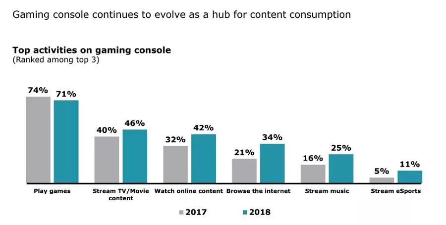 游戏与其他媒体娱乐项目竞争的形式不仅体现在时间上,还体现在游戏平台吸引粉丝的方式上。消费者不只是喜欢玩游戏,他们还喜欢看精彩的游戏比赛。调查发现,32%的受访者每周都会看游戏视频。电子竞技专业选手和粉丝之间的密切互动,每天都吸引着着百万+的观众看专业选手直播打游戏。
