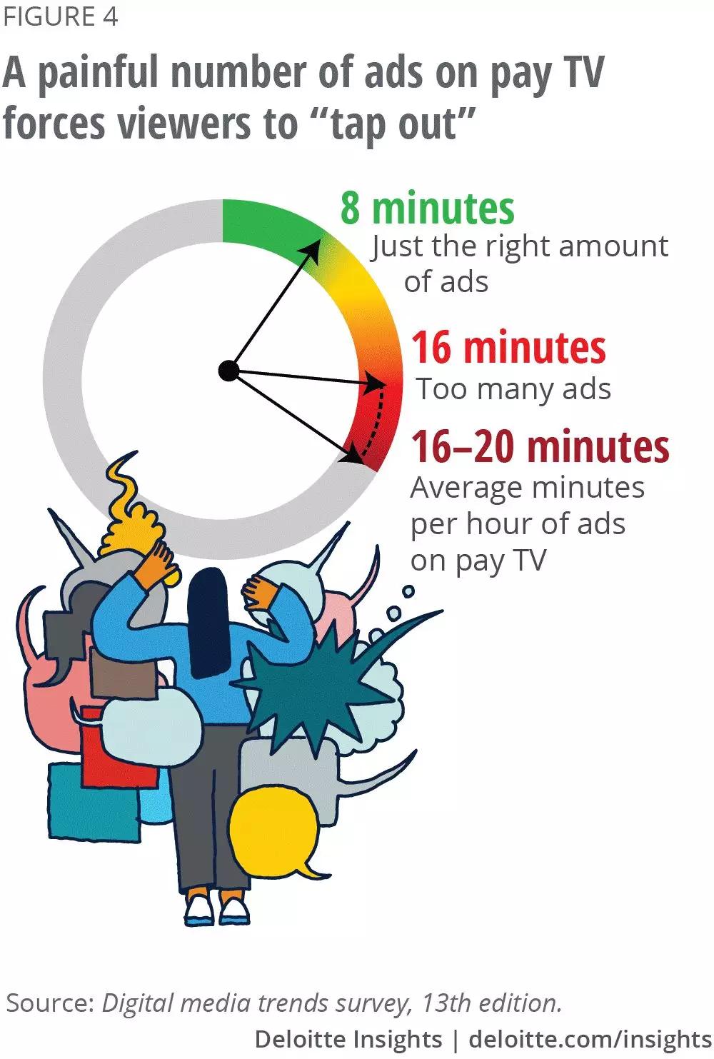 75%的消费者表示付费电视广告太多。消费者认为每小时8分钟的广告时间比较合适,并表示,广告若大于16分钟,他们就不会再看了。但付费电视通常每小时有16到20分钟的广告。一些消费者接受不了这么长时间的广告,所以他们选择放弃看节目。