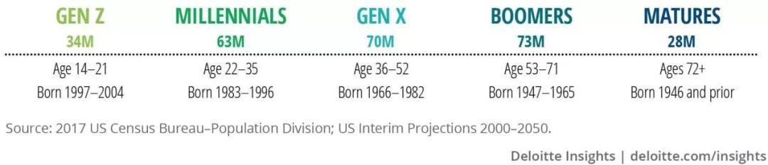 2018年12月至2019年2月三个月间,德勤媒体电信部(Technology,Media&Telecommunications)进行了第13次数字媒体趋势调查。这家独立研究公司根据美国最新人口普查数据,将参与到调查的2003名美国消费者划分为五代,分别为: