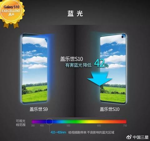 在OLED屏幕成为主流的同时,三星也没忘记加入对蓝光量的控制。这一次三星S10的屏幕已经通过了 TüVRheinland“Eye Comfort”认证,相比三星S9蓝光量降低了42%。