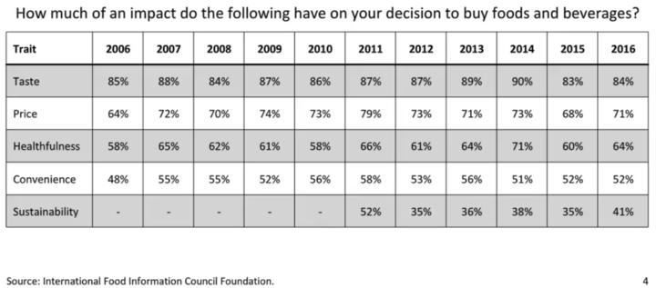 根据国际食物信息组织的统计,尽管 70% 的称自己「愿意」为了气候变化的影响调整饮食方式。但实际上,这么多年来,人们考虑购买食物因素里,第一位的依然是「口味」,身体还是很诚实的。