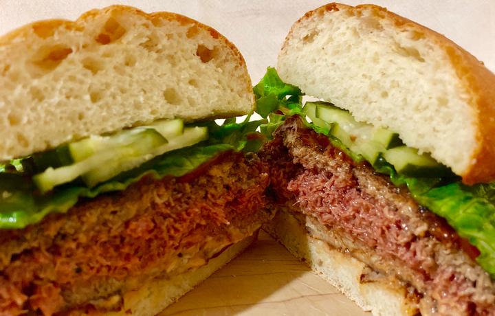 这中间的人造肉肉饼,来自加州红木城的初创公司 Impossible Foods。材料全是大豆,还有从大豆根部提取的红色血红质。它不仅让肉饼看着像真肉,闻着像煎肉,一口咬下去,还有嚼肉的劲儿,甚至跟半熟牛肉饼一样,还流着红色血水。