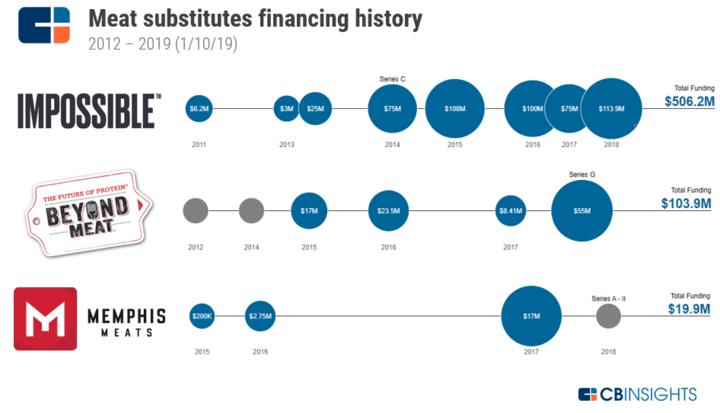 而上述提到的 Impossible Foods 和 BeyondMeat 是拿钱最多的两大公司,不仅拿下累计 5 亿和 1 亿美元的投资,后者今年准备在纽交所上市。
