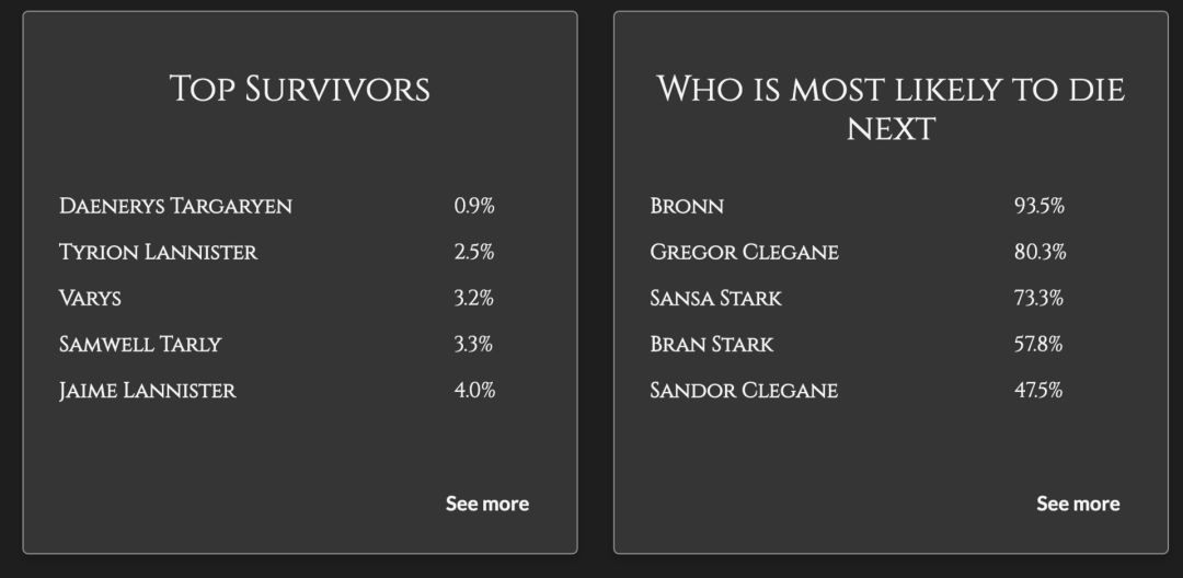 根据算法,龙妈DaenerysTargaryen(丹妮莉斯·塔格利安)生存的几率最高,达到了99%,小恶魔TyrionLannister(提利昂·兰尼斯特)也有97%的存活率。