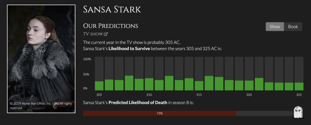 忍辱负重的Sansa有命撑到第8季也是实属不易,但预测高达73%的死亡率如何在剧中实现,我们可以拭目以待。