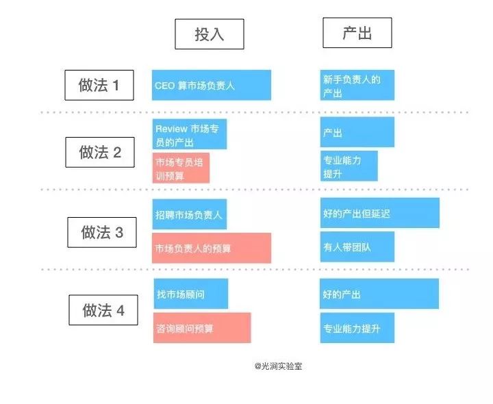 我们可能会说,看起来没有更好的选择了。其实不然。下图是4种可能的做法,以及每种做法的投入和结果。如果CEO本人不擅长市场工作,做法1是杠杆率最低的。