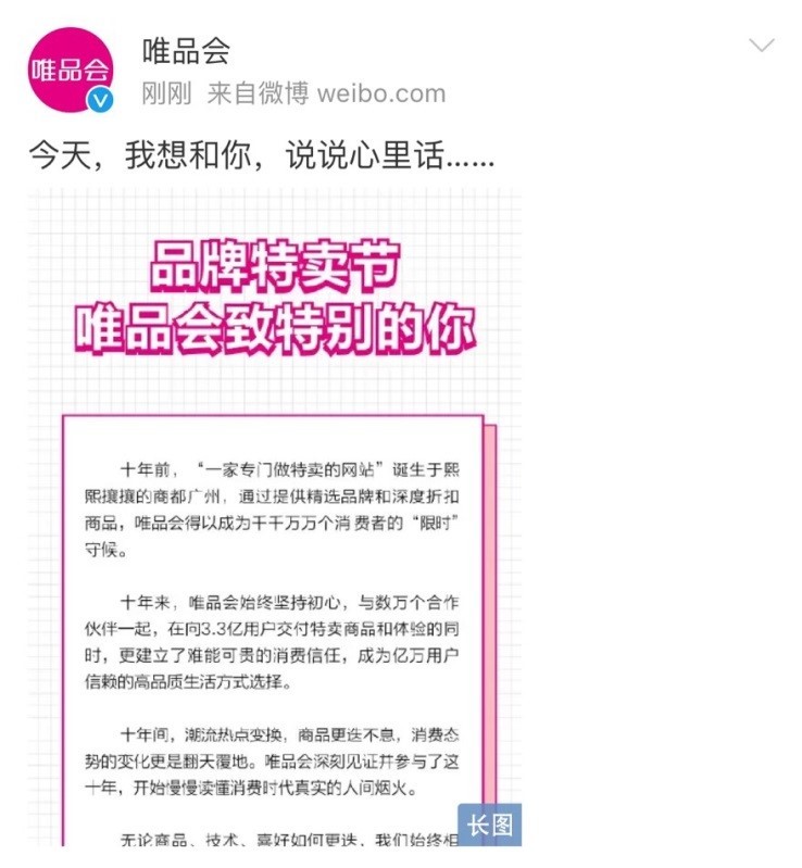 2019 年 4 月 15 日上午 10 点,唯品会官微发布了一封致用户信,信中唯品会回顾了十年发展历程,十年来唯品会为 3.3 亿用户提供高品质的特卖商品与幸福体验。见证了每一位用户最特别的时刻,并深刻认识到用户消费越来越理性、科学与聪慧。