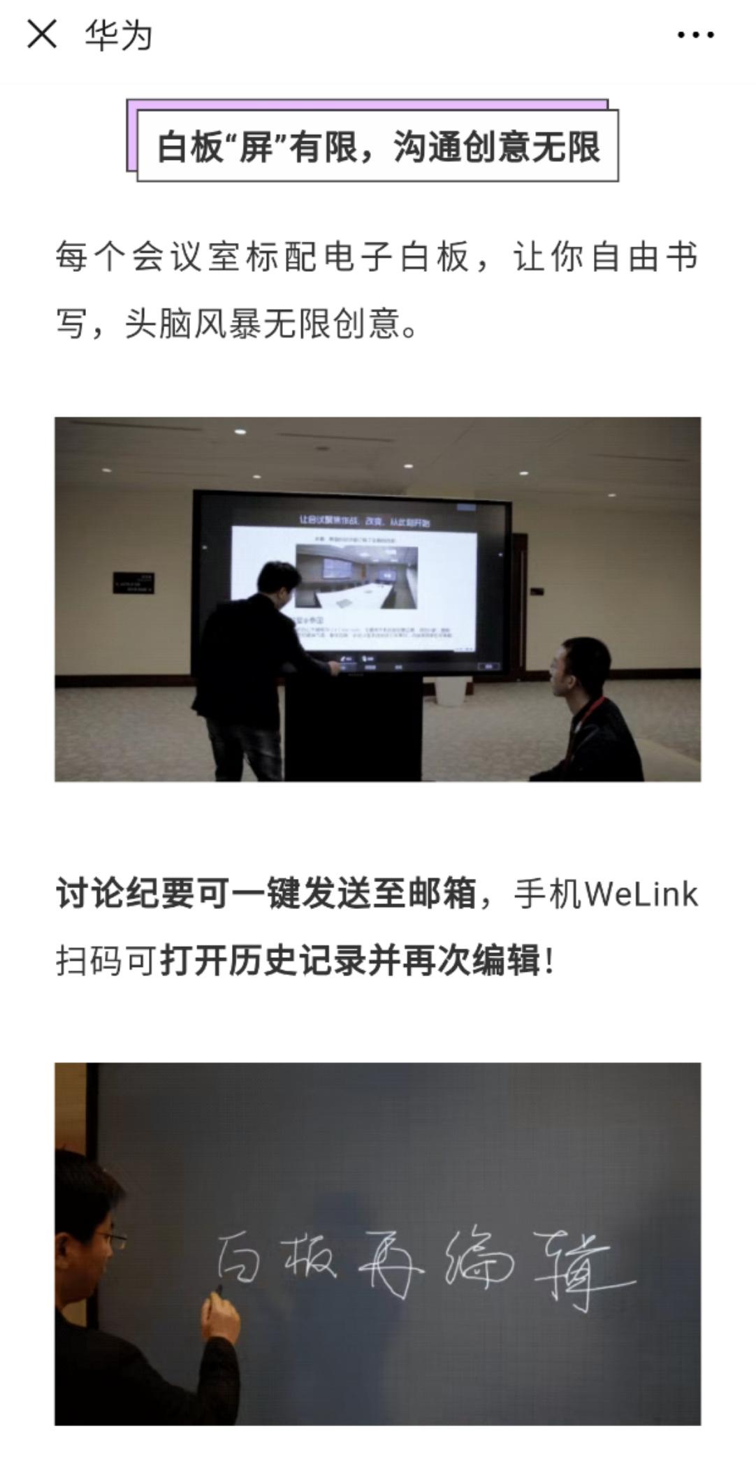同时,在华为数字化会议室里,视频会议共享资料、异地讨论等功能在日常会议中被广泛使用;白板批注、书写、会议纪要一键发送等功能,也极大提升会议协作效率。会议中,员工们将头脑风暴后沉淀下来的观点书写在会议平板上;会后只需轻点“发送”按钮,就可将会议内容发给所有相关同事。