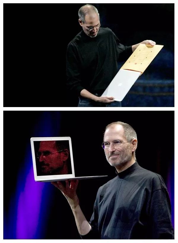 这是第一张MacBookAir发布会的照片。我印象极其深刻,就是乔布斯带着一个信封上来,说这信封里是什么东西呢?上来之后,人家把信封解开,从里面掏出一笔记本电脑出来,哇!整个世界轰动了。