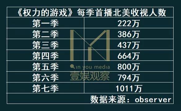 根据observer相关数字统计,虽然《权力的游戏》第五季到第六季的收视人数下降了不到1%,但在之后的第七季首播时却迎来了爆发式的增长。第七季时北美首播人数比第六季同期增长27.3%。