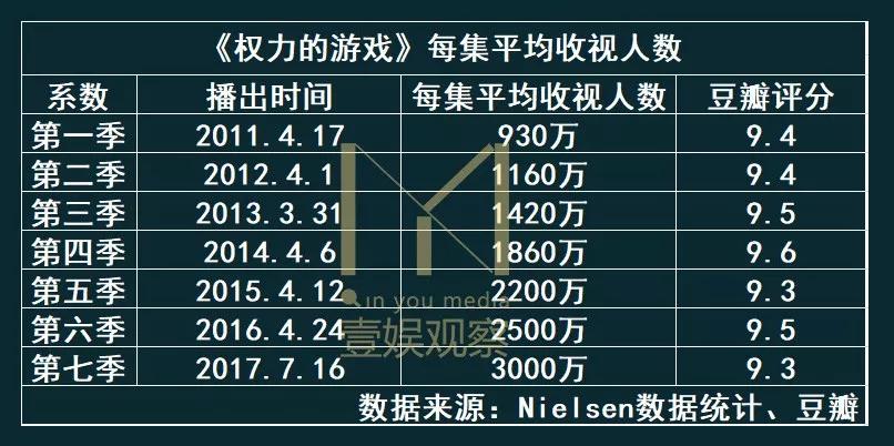《权力的游戏》每季收视数据统计,数据来源:Nielsen、豆瓣