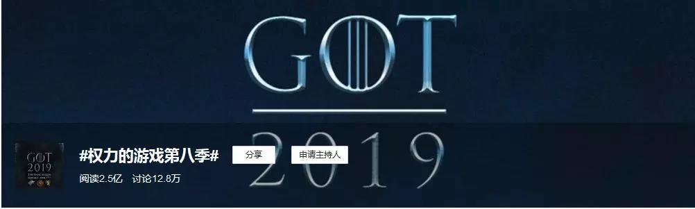 在豆瓣上,第八季《权力的游戏》已经吸引了超过两万人参与评价,第一集刚刚播出,评分就高达9.8,目前是该系列之最。而微博#《权力的游戏》第八季#话题度超过2.5亿次阅读,超过了12.8万人次讨论。