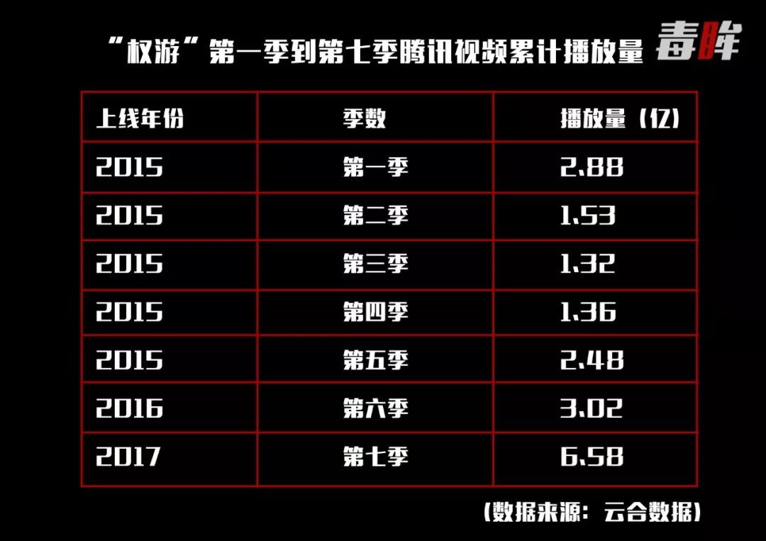 虽然仍会受到盗版困扰,但是腾讯视频上的“权游”也越来越热,在腾讯视频和在美国上线的时间差越来越短,直到昨天上线的第八季基本实现了两地同步。从2015年引进起,“权游”腾讯视频上的累计播放量每年都在增长,从2015年第五季的2.48亿,到2016年第六季的3.02亿,并在2017年第七季翻倍升至6.57亿。有“权游”粉丝告诉毒眸,“虽然之前听说“权游”很火,但一直嫌麻烦没有下载过,成为腾讯视频会员后,图方便就一口把几季“权游”看了,从此’沦陷’为粉丝,开始关注‘权游’粉丝社区、冰火维基等。”