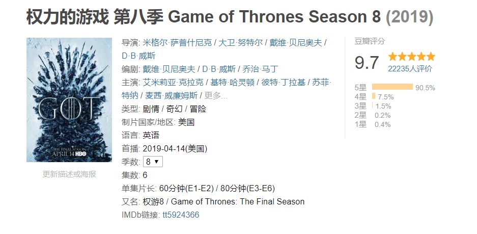 《权力的游戏》(以下简称“权游”)有多火?不仅屡次打破HBO收视记录,还连续6年居于盗链下载榜榜首(TorrentFreak数据),号称全球12亿粉丝;烂番茄新鲜度每季保持在95%以上,豆瓣评分每季9分以上;历年在艾美奖上横扫全场,总共拿下47座奖杯。